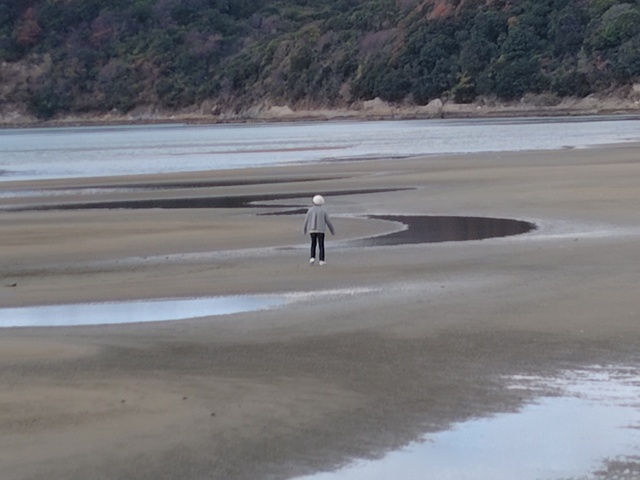 朝は潮が引き、遠浅の白い浜辺が姿を現し、趣が全く変わりました!近隣の皆様でお掃除されるのでしょうか?美しい浜辺は気持ちのいい場所でした。